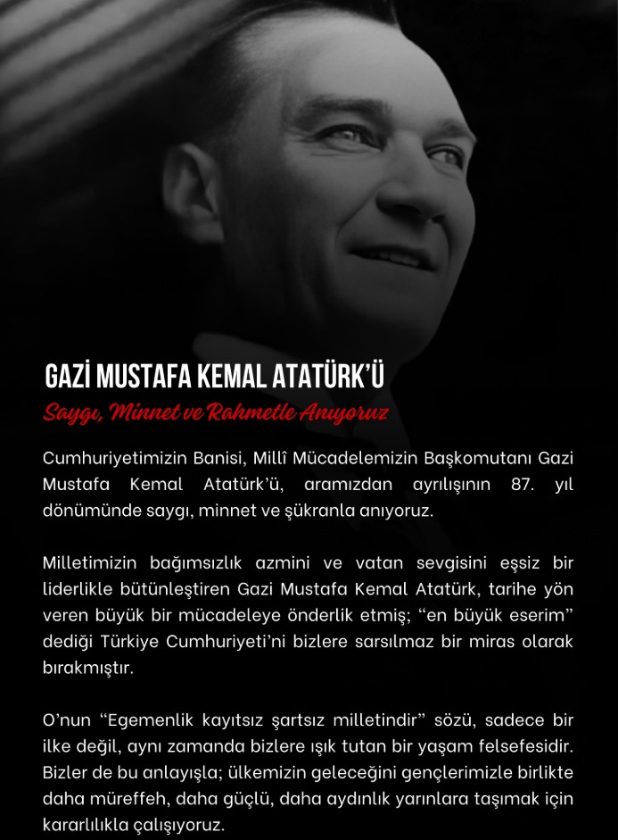 “Cumhuriyetimizin kurucusu Gazi Mustafa Kemal Atatürk’ü, ebediyete irtihalinin 87. yıl dönümünde rahmet, minnet ve saygıyla anıyoruz. O’nun önderliğinde verilen bağımsızlık mücadelesi, Türk milletinin azim ve kararlılığının en büyük göstergesidir. Atatürk’ün bizlere emanet ettiği Cumhuriyet, milletimizin birlik ve beraberliğiyle sonsuza dek yaşayacaktır. Bu emaneti korumak ve daha ileri taşımak hepimizin ortak sorumluluğudur.”