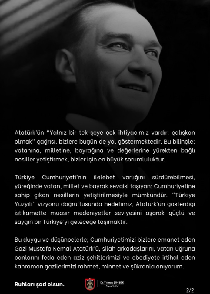 Sivas Valisi Yılmaz Şimşek, Türkiye Cumhuriyeti’nin kurucusu Gazi Mustafa Kemal Atatürk’ün ebediyete irtihalinin 87. yıl dönümü dolayısıyla bir mesaj yayımladı.