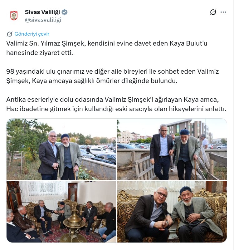 Sivas Valisi Yılmaz Şimşek, kendisini evine davet eden 98 yaşındaki Kaya Bulut’u hanelerinde ziyaret etti.