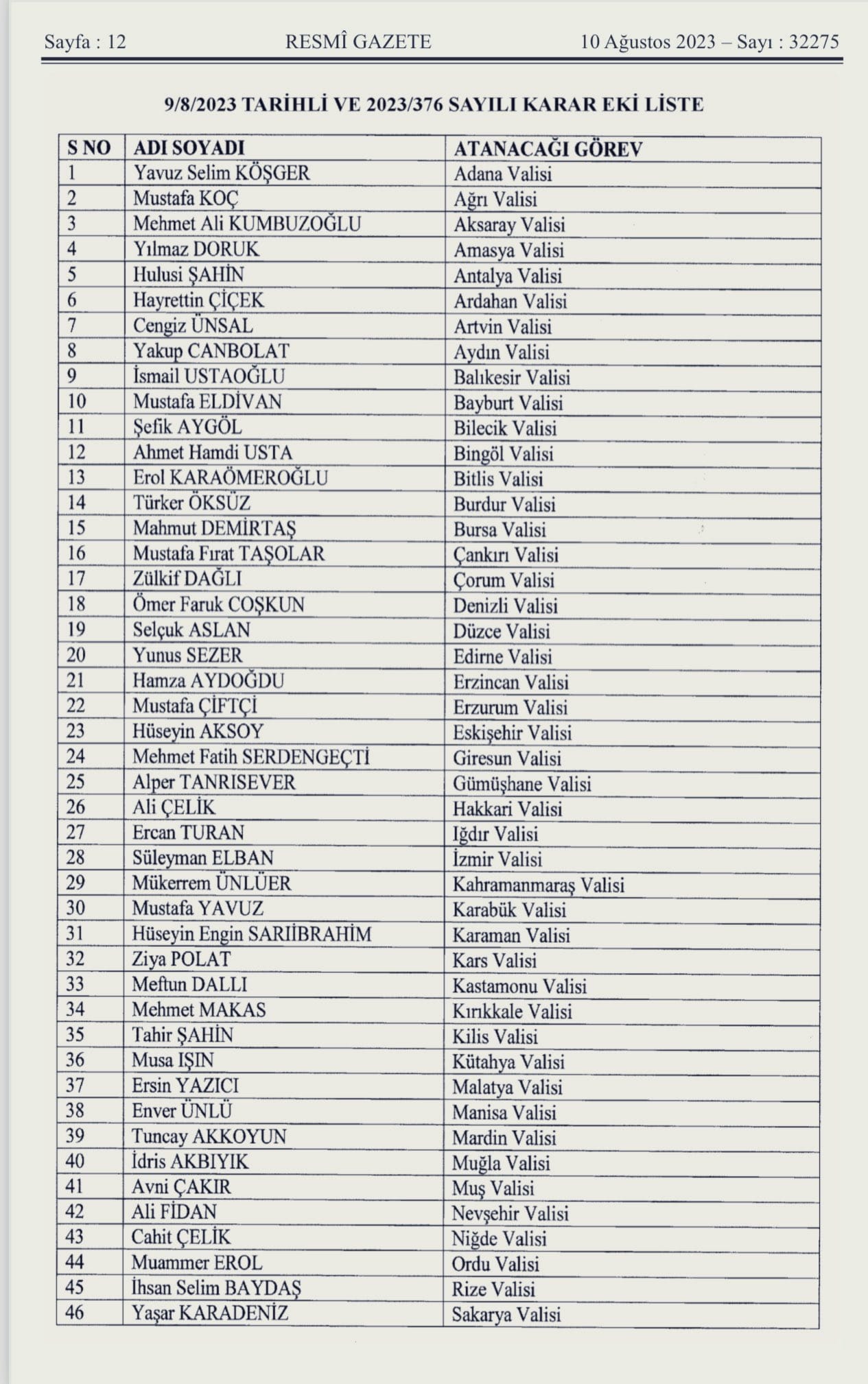 Cumhurbaşkanı Recep Tayyip Erdoğan’ın imzasıyla Resmi Gazete’de yayımlanan kararname ile Yavuz Selim Köşger Adana’ya, Mustafa Koç Ağrı’ya, Mehmet Ali Kumbuzoğlu Aksaray’a, Yılmaz Doruk Amasya’ya, Hulusi Şahin Antalya’ya, Hayrettin Çiçek Ardahan’a, Cengiz Ünsal Artvin’e, Yakup Canbolat Aydın’a, İsmail Ustaoğlu Balıkesir’e,