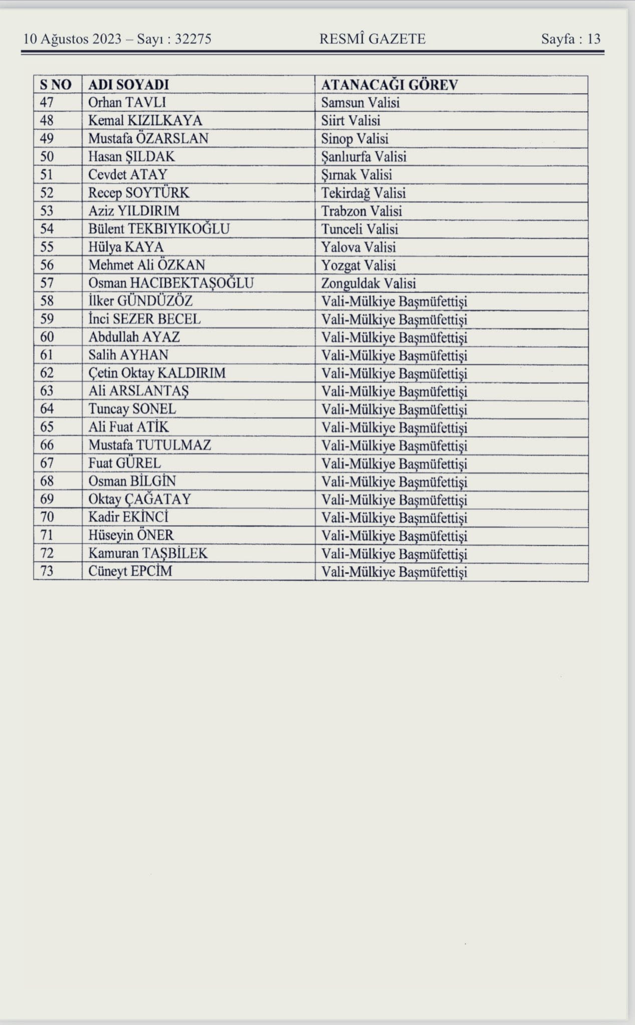 Kararnameye göre, İlker Gündüzöz, İnci Sezer Becel, Abdullah Ayaz, Salih Ayhan, Çetin Oktay Kaldırım, Ali Arslantaş, Tuncay Sonel, Ali Fuat Atik, Mustafa Tutulmaz, Fuat Gürel, Osman Bilgin, Oktay Çağatay, Kadir Ekinci, Hüseyin Öner, Kamuran Taşbilek ve Cüneyt Epcim “vali-mülkiye başmüfettişliği” görevine getirildi.