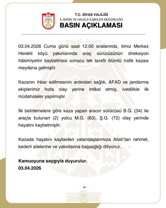 Sivas’ta Trafik Kazasında 3 Kişi Hayatını Kaybetti.. Sivas’ta meydana gelen trafik kazasında 3 kişi yaşamını yitirdi. Olay, 3 Nisan 2026 Cuma günü saat 12.00 sıralarında Merkez Herekli köyü yakınlarında gerçekleşti.