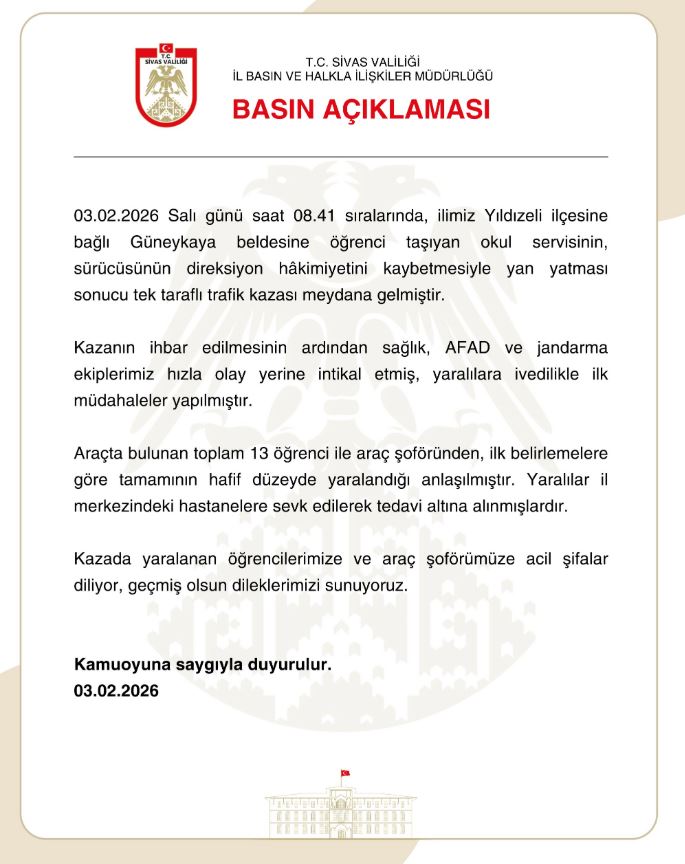 13 Öğrenci ve Şoför Yaralandı.. Sivas’ın Yıldızeli ilçesine bağlı Güneykaya beldesinde öğrenci taşıyan okul servisinin yan yatması sonucu tek taraflı trafik kazası meydana geldi.