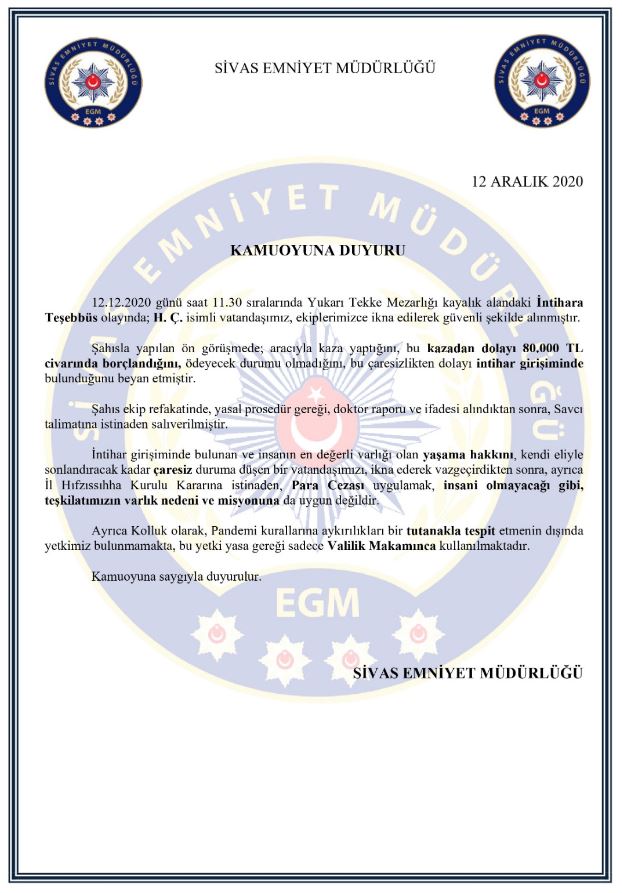 Gün içerisinde Sivas’ta sokağa çıkma kısıtlamasını delerek uçurumda intihar a kalkışan gence, sokağa çıkma kısıtlamasını ihlalden Sivas İl Emniyet Müdürlüğü tarafından 3 bin 150 TL'lik tutanak tutulmuştu.