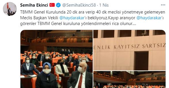 Sosyal medyada geçtiğimiz gün Vekil Ekinci yaptığı "TBMM Genel Kurulunda 20 dk ara verip 40 dk meclisi yönetmeye gelemeyen Meclis Başkan Vekili Haydar Akar ’ı bekliyoruz. Kayıp aranıyor Haydar Akar ’ı görenler TBMM Genel kuruluna yönlendirmeleri rica olunur...." paylaşımı ile Akar'ı eleştirirken, 48 saat boyunca Bakan İsmet Yılmaz dahil olmak üzere AK Parti Genel Başkan Yardımcıları, Merkez İlçe Başkanı Burak Kuruçay ve Sivas'tan hiç kimsenin ulaşamadığı Aksu'ya bu konuyla alakalı ne dediği öncelikle merak ediliyor...