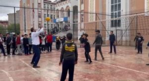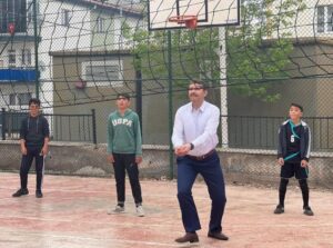 Sivas Valisi Salih Ayhan, Şehit Adnan Saka Ortaokuluna yaptığı ziyaret sırasında öğrencilerle birlikte voleybol oynadı.