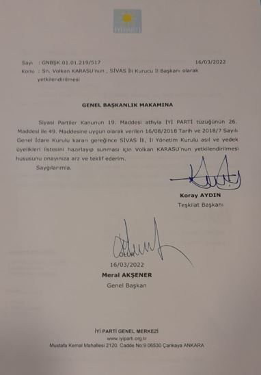 İYİ Parti Sivas İl Başkanlığı'nda sonunda kazanan taraf belli oldu. Bir süredir eski İl Başkanmı Yusuf Koç ile İl Başkan Yardımcısı Volkan Karasu arasında devam eden çekişme, Karasu'nun bugün İYİ Parti Genel Merkezinde Teşkilat Başkanı Koray Aydın'dan yetki belgesini alması ile son buldu.