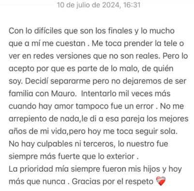 Sonları ne kadar zor olsa da benim için o kadar zor. Televizyonu açmam ya da gerçek olmayan iddiaları izlemem gerekiyor. Ama bunu kabul ediyorum çünkü bu benim sorunumun, kim olduğumun bir parçası. Ayrılmaya karar verdim ama Mauro ile aile olmaktan vazgeçmeyeceğiz. Aşk varken bin kez daha denemek de hata değildi. Hiçbir şeyden pişman değilim, bu ilişkiye hayatımın en güzel yıllarını verdim ama bugün yalnız devam etmek zorundayım. Suçlanacak kimse yok ve üçüncü şahıslar da yok, aramızdaki şey her zaman dışarıdan daha güçlüydü. Önceliğim her zaman çocuklarım oldu ve bugün her zamankinden daha fazla. Saygınız için teşekkür ederim.
