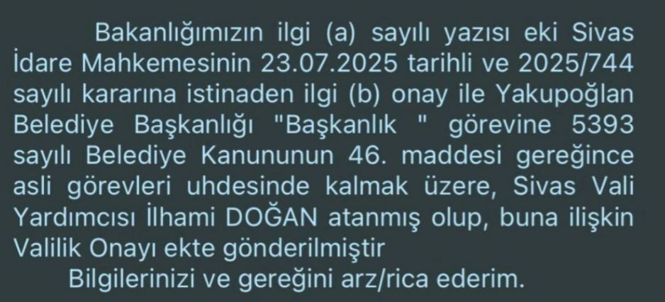 5393 sayılı Belediye Kanunu’nun 46. maddesi gereğince Yakupoğlan Belediyesi Başkanlığı görevine, asli görevleri uhdesinde kalmak üzere Sivas Vali Yardımcısı İlhami Doğan atandı.