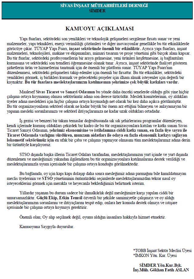 TÜYAP Yapı Fuarı gibi sektörel etkinliklerin inşaat dünyası için büyük önem taşıdığına dikkat çeken Sivas Müteahhitler Derneği (SİMDER) Yönetim Kurulu Başkanı Gökhan Fatih Aslan, Sivas Ticaret ve Sanayi Odası’nın (STSO) bu alanda hiçbir çalışma yapmamasını eleştirdi.