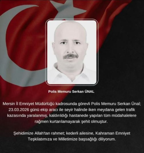 Yaralanan polis memuru Serkan Ünal şehit oldu.. Mersin’de görev sırasında trafik kazası geçiren polis memuru Serkan Ünal, hastanede verdiği yaşam mücadelesini kaybederek şehit oldu.