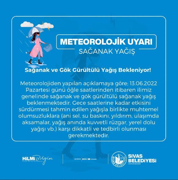 Sivas Belediyesi'nden yapılan açıklamada, "Meteorolojiden yapılan açıklamaya göre; 13.06.2022 Pazartesi günü öğle saatlerinden itibaren ilimiz genelinde sağanak ve gök gürültülü sağanak yağış beklenmektedir.