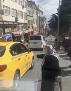 Bir süre bekledikten sonra bir taksi durdurabildi. Yaşlı kadına nereye gideceğini soran taksici mesafeyi beğenmeyerek yoluna devam etti. Yanından geçen ve kendisini almayan taksicilere yalvaran yaşlı kadının zor anları cep telefonu kamerasıyla kaydedildi.