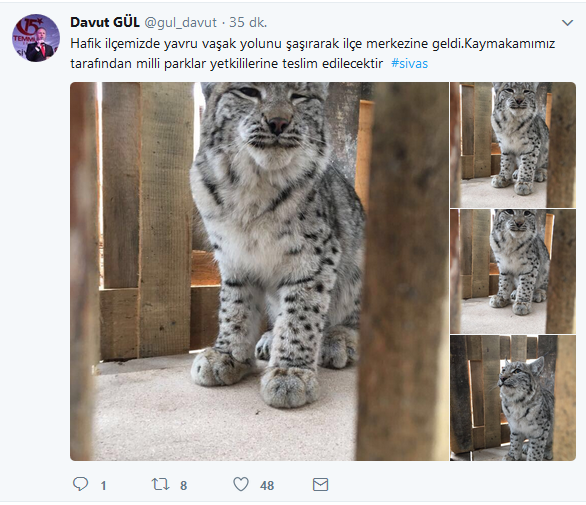 Sivas Valisi Davut Gül Twitter hesabından yaptığı açıklamada, “Hafik ilçemizde yavru vaşak yolunu şaşırarak ilçe merkezine geldi. Kaymakamımız tarafından milli parklar yetkililerine teslim edilecektir” ifadesine yer verdi.