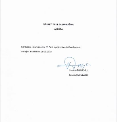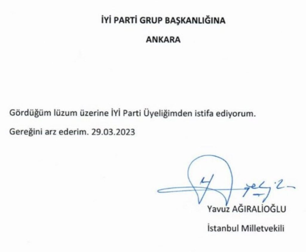 Az önce İstanbul Milletvekili Yavuz Ağıralioğlu partisinden istifa etti.