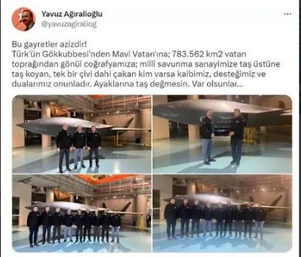 Paylaşımında; "Bu gayretler azizdir. Türk'ün Gökkubbesi'nden Mavi Vatanı'na, 783.562 kilometre kare vatan toprağından gönül coğrafyamıza; milli savunma sanayimize taş üstüne taş koyan, tek bir çivi dahi çakan kim varsa, kalbimiz, desteğimiz ve dualarımız onunladır. Ayaklarına taş değmesin. Var olsunlar." ifadelerine yer verdi. (HABER MERKEZİ)