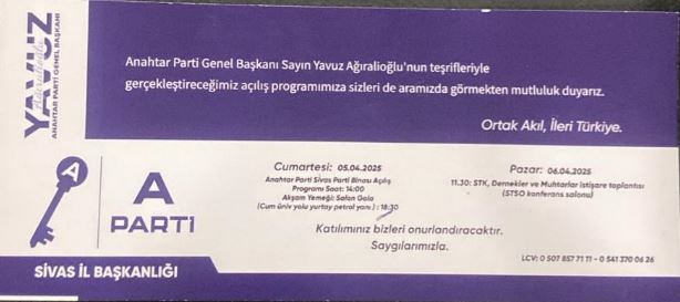 Anahtar Partisi Genel Başkanı Yavuz Ağıralioğlu, 5 Nisan 2025 Cumartesi günü saat 14.00’te Anahtar Partisi Sivas İl Başkanlığı binasının açılışını gerçekleştirecek. Açılış töreninin ardından kentte çeşitli programlara katılması beklenen Ağıralioğlu, vatandaşlarla ve partililerle bir araya gelecek.