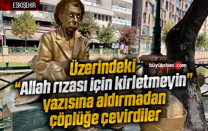 Porsuk Çayı kenarında yer alan ve hem yerli hem de yabancı turistlerin yoğun şekilde fotoğraf çektirdiği heykel, bilinçsiz vatandaşların azizliğine uğramaya başladı. Heykeldeki balık kovası, üzerinde yer alan “Allah rızası için Porsuk Çayı’nı kirletmeyin” yazısına rağmen adeta çöp kovasına döndü.