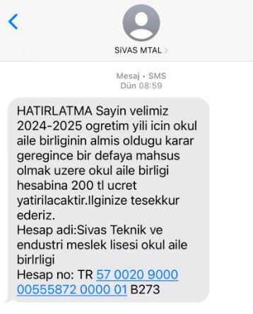 Organize Sanayi Bölgesi’nde bulunan Sivas Mesleki Teknik Anadolu Lisesindeki yemek ve servis ücretlerinin ücretli hale gelmesi, veliler tarafından eleştirilmeye devam ederken, okulla ilgili yeni bir gelişme daha tepkilere yol açtı. Veliler, okul aile birliğinin kararıyla tek sefere mahsus 200 TL bağış yapılması talep edilen bir mesaj aldıklarını belirtti.