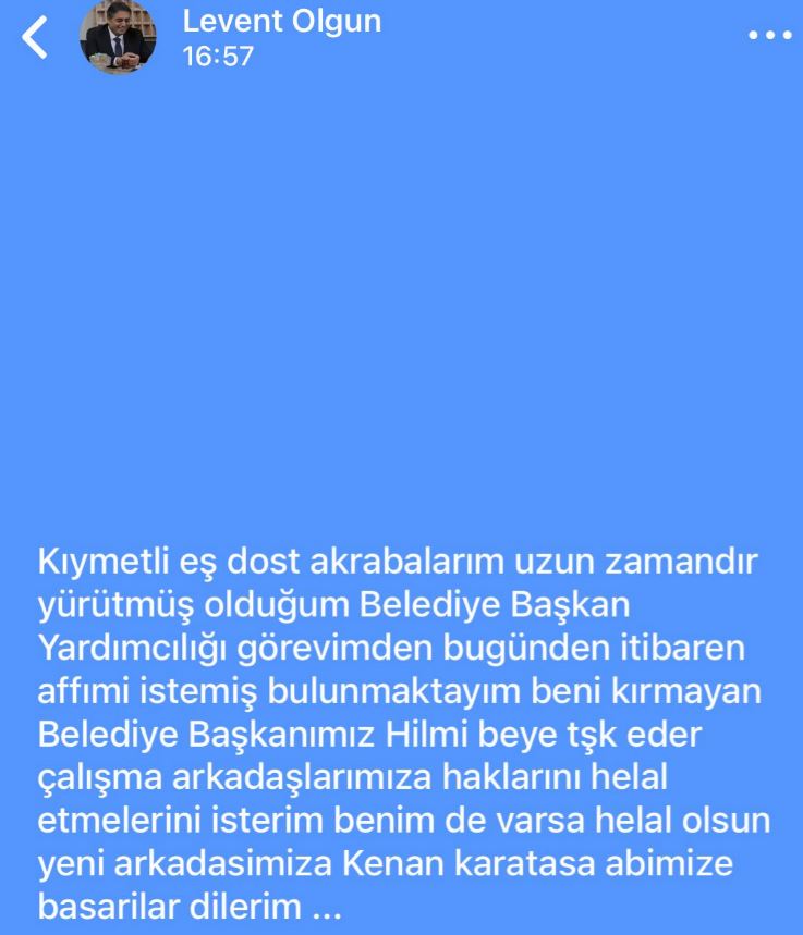 Geçtiğimiz günlerde Başkan Bilgin'den affını isteyen Belediye Başkan Yardımcısı Levent Olgun'un dilekçesini Bilgin kabul ederek Olgun'un yerine Belediye Fen İşleri Müdürü Kenan Karataş'ı yeni başkan yardımcısı olarak atadı...