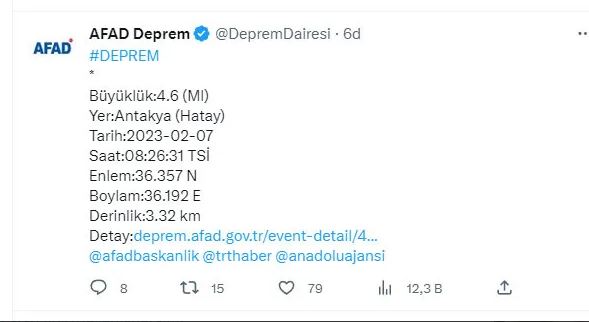 Hatay'da yeni deprem oldu. AFAD'dan yapılan açıklamaya göre Antakya ilçesinde saat 08.26'da 4.6 şiddetinde bir deprem meydana geldi.