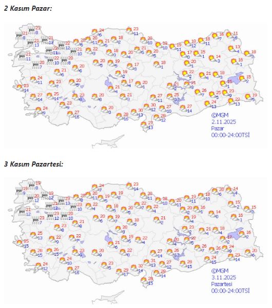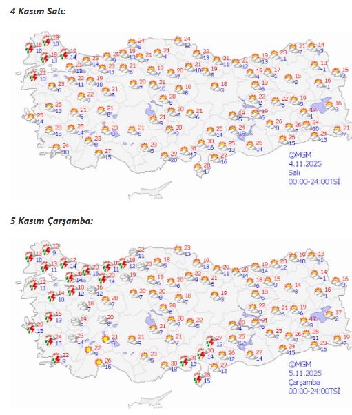 Pazar günü Türkiye genelinde parçalı ve az bulutlu bir hava beklenirken, yeni haftayla birlikte batı bölgelerinde bulutlanma ve yerel sağanak yağışlar etkili olacak. Ege, Akdeniz ve İç Anadolu bölgelerinde sıcaklıkların 20–28 derece arasında seyretmesi bekleniyor.