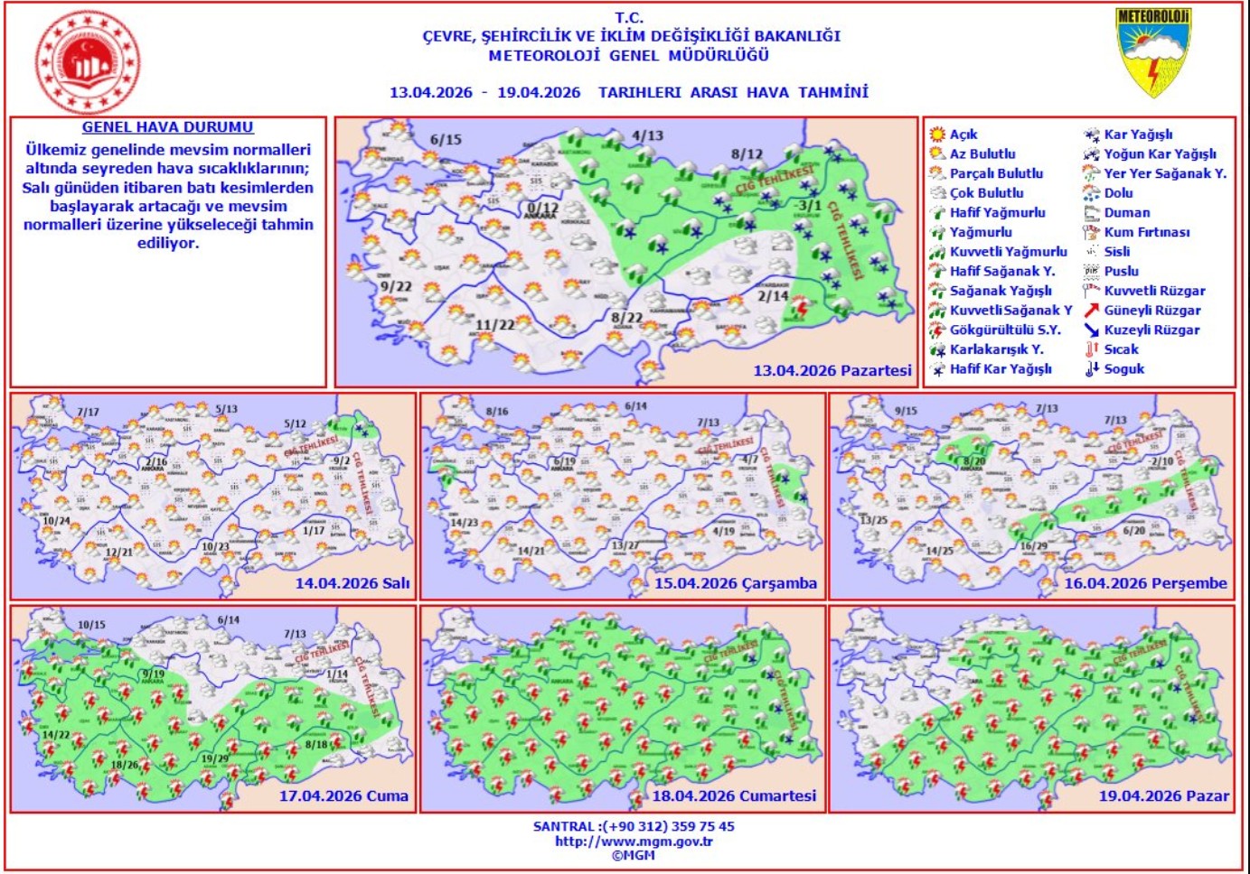 Yeni Haftada Hava Değişiyor...Meteoroloji Genel Müdürlüğü, 13-19 Nisan tarihlerini kapsayan haftalık hava tahmin raporunu yayımladı.