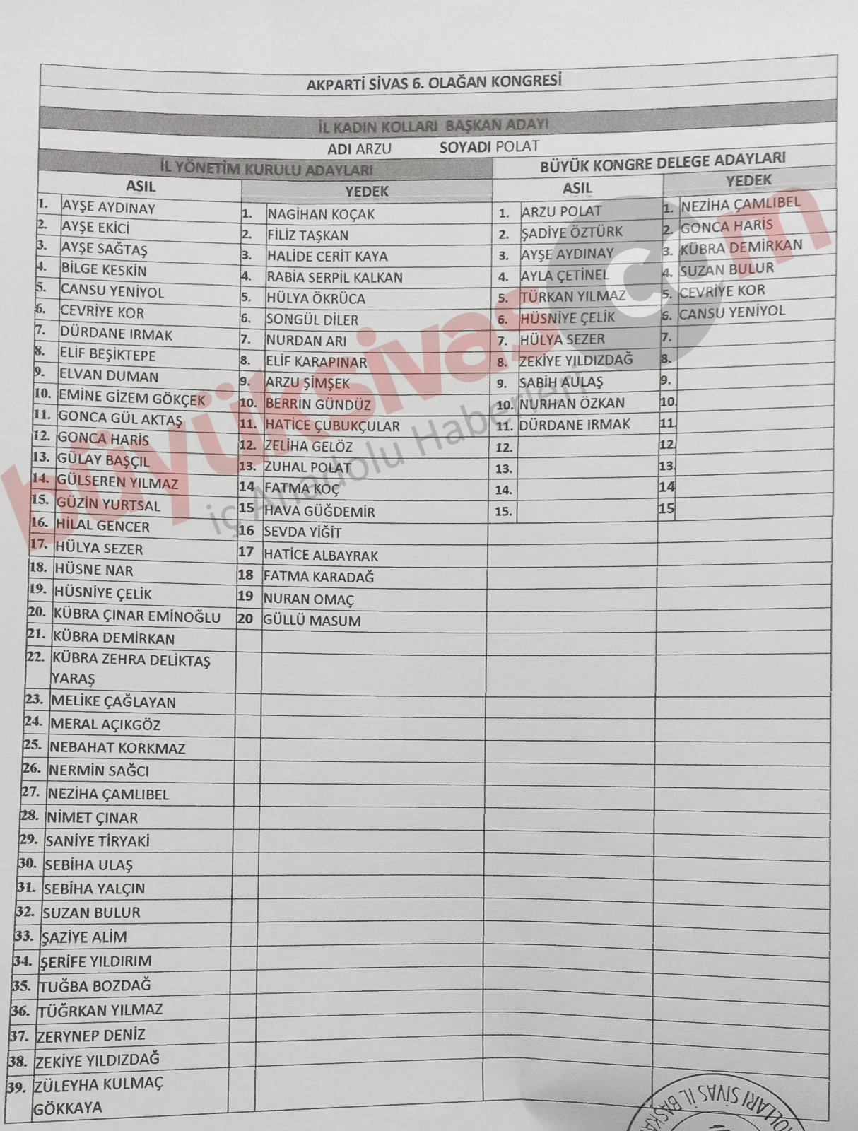 AK Parti Sivas Kadın Kolları ve Gençlik Kolları 6. Olağan İl Kongreleri geçtiğimiz günlerde gerçekleştirildi. Geçtiğimiz yıllarda AK Parti Kadın Kolları Başkanlığı görevinde bulunan Şadiye Öztürk'ten sonra, Başkan Semiha Ekinci ve son olarak Başkan Arzu Polat aynı yönetim kurulu üyeleriyle yüksek oranda yola devam ederken gençlik kollarında ise yaş haddi nedeniyle doğal bir sirkülasyon yaşandı.