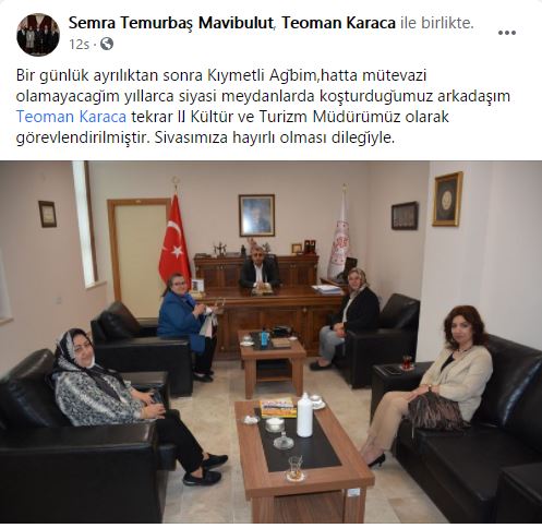 Konuyla alakalı AK Parti Sivas İl Genel Meclis Üyesi Semra Temurbaş Mavibulut "Bir günlük ayrılıktan sonra Kıymetli Ağbim, hatta mütevazi olamayacağım yıllarca siyasi meydanlarda koşturduğumuz arkadaşım Teoman Karaca tekrar İl Kültür ve Turizm Müdürümüz olarak görevlendirilmiştir. Sivasımıza hayırlı olması dileğiyle." mesajını paylaştı.