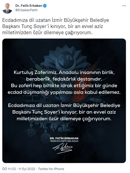 Yeniden Refah Partisi Genel Başkanı Dr. Fatih Erbakan yaptığı açıklamada: "Ecdadımıza dil uzatan İzmir Büyükşehir Belediye Başkanı Tunç Soyer'i kınıyor, bir an evvel aziz milletimizden özür dilemeye çağırıyorum." ifadelerine yer verdi.