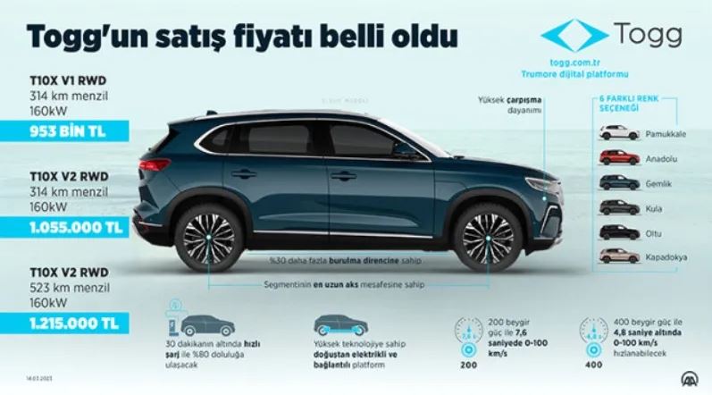 Türkiye'nin ilk yerli ve akıllı otomobili Togg'da ön sipariş süreci 16 Mart'ta başladı. Standart menzilli modeli 953 bin, uzun menzilli modelin fiyatı ise 1 milyon 215 bin lira olarak açıklanan Togg'da adeta talep patlaması yaşandı.