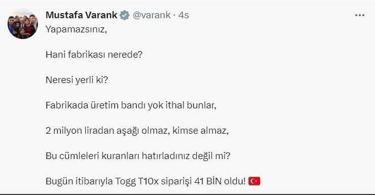Aradan geçen zamanda Togg'da ön sipariş sayısı 50 bine yaklaştı. Twitter hesabından paylaşım yapan Sanayi ve Teknoloji Bakanı Mustafa Varank, son durumu aktardı. Bakan Varank, şunları söyledi: "Yapamazsınız, Hani fabrikası nerede? Neresi yerli ki? Fabrikada üretim bandı yok ithal bunlar, 2 milyon liradan aşağı olmaz, kimse almaz, Bu cümleleri kuranları hatırladınız değil mi? Bugün itibarıyla Togg T10x siparişi 41 bin oldu!"