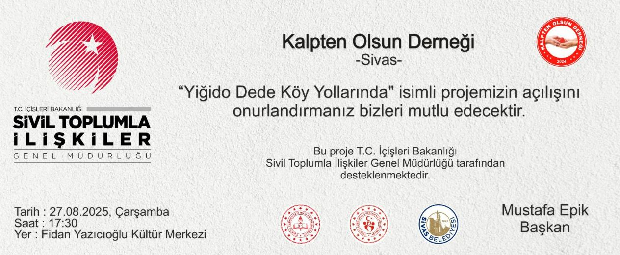 T.C. İçişleri Bakanlığı Sivil Toplumla İlişkiler Genel Müdürlüğü tarafından desteklenen “Yiğido Dede Köy Yollarında” projesi, 27 Ağustos 2025 Çarşamba günü saat 17.30’da Fidan Yazıcıoğlu Kültür Merkezi’nde yapılacak açılış töreniyle hayata geçirilecek.