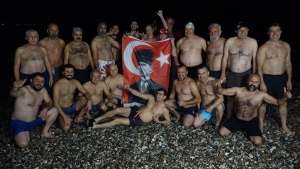 2022’yi denizde karşılayan yaklaşık 10 kişi, ellerinde Türk bayrakları ve Mustafa Kemal Atatürk posteriyle sahilde 10’dan geriye sayıp, saatler gece yarısını gösterdiğinde hep birlikte denize girdi. Grup üyeleri, hava sıcaklığının 10, deniz suyu sıcaklığının ise 18 dereceyi gösterdiği kentte denizin keyfini doyasıya sürdü.