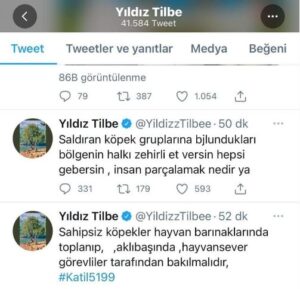 Sanatçı Yıldız Tilbe, 12 Mart’ta sosyal medya hesabından sokak köpekleriyle ilgili paylaşımlarda bulunmuş, paylaşımlarında ‘saldıran köpek gruplarına bulundukları bölgenin halkı zehirli et versin, hepsi gebersin, insan parçalamak nedir ya’ ifadelerini kullanmıştı.