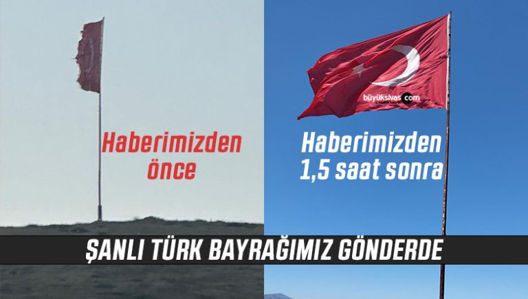 Sabah saat 10.00 sıralarında “Sivas’taki bu bayrak ne zamandır bu halde… Hiç mi vicdanınız yok?” başlığında yayınladığımız haber kısa sürede etkisini gösterdi. Haberimiz etkisini gösterdi! Sivas’taki yıpranan bayrak 1,5 saat sonra yenilendi Sivas’ın Yıldızeli ilçesi Güneykaya beldesinde yıpranan Türk Bayrağı yetkililer tarafından kısa sürede değiştirildi… Göndere çekilen ay yıldızlı bayrağımız dalgalanmaya başlarken yayınladığımız haberin üzerinden … Haberimiz etkisini gösterdi! Sivas’taki yıpranan bayrak 1,5 saat sonra yenilendi okumayı sürdür