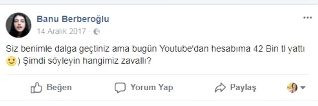 Youtube'de adeta viral olan Banu Berberoğlu, kendisiyle dalga geçenlere adeta ayar verdi. Berberoğlu, aralık ayında Youtube tarafından kendisine 42 bin TL yatırıldığını bu sözlerle duyurdu: "Siz benimle dalga geçtiniz ama bugün bugün Youtubedan hesabıma 42 bin TL yattı :)) Şimdi söyleyin hangimiz zavallı?" (haber7)