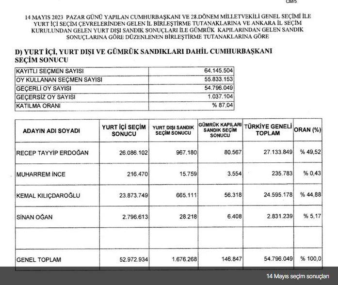 Buna göre, Cumhurbaşkanı Recep Tayyip Erdoğan 49,52, CHP Lideri Kemal Kılıçdaroğlu 44,88, ATA İttifakı adayı Sinan Oğan 5,17, adaylıktan çekilen Memleket Partisi Genel Başkanı Muharrem İnce ise 0,43 oy aldı.