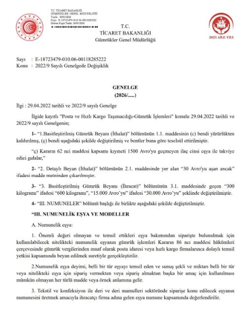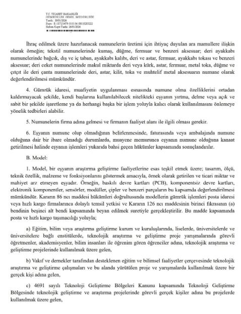 Genelgede “numunelik eşya” tanımı da yeniden düzenlenerek sipariş alma veya verme amacı dışında kullanılması mümkün olmayan, önemli ticari değeri bulunmayan ürünler bu kapsamda değerlendirildi. Tekstil ve deri sektöründe ihracatçı firmalar adına gelen üretim amaçlı örnekler de numune kapsamında sayılacak.
