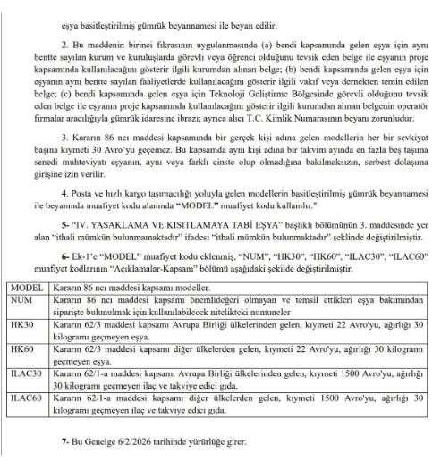 Yeni düzenleme kapsamında değeri 30 euroyu aşmayan ve “MODEL” muafiyet kodu ile beyan edilen ürünler, belirli şartlar altında Basitleştirilmiş Gümrük Beyannamesi (BGB) ile ithal edilebilecek. Uygulama, posta ve hızlı kargo taşımacılığı yoluyla gelen numune ve model ürünler için geçerli olacak.