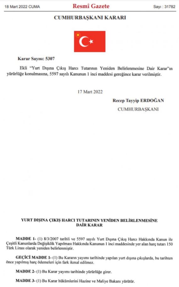 “8/3/2007 tarihli ve 5597 sayılı Yurt Dışına ÇıkışHarcı Hakkında Kanun ile Çeşitli Kanunlarda Değişiklik Yapılması Hakkında Kanunun 1'inci maddesinde yer alan harç tutarı 150 Türk Lirası olarak yeniden belirlenmiştir.”