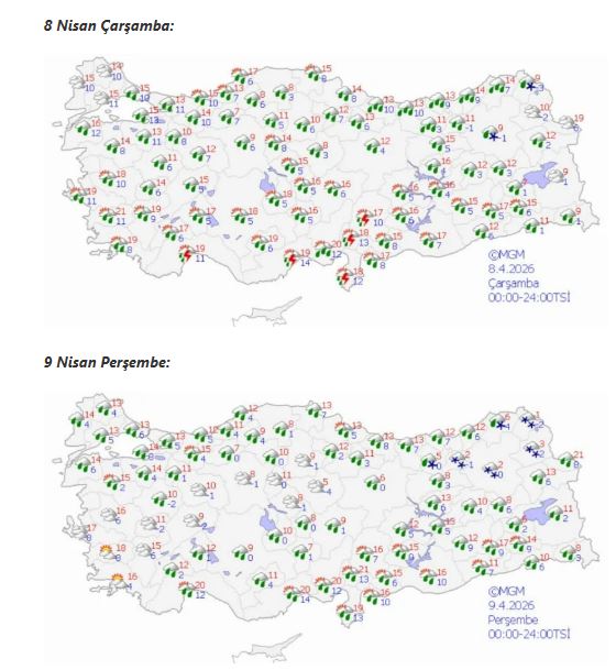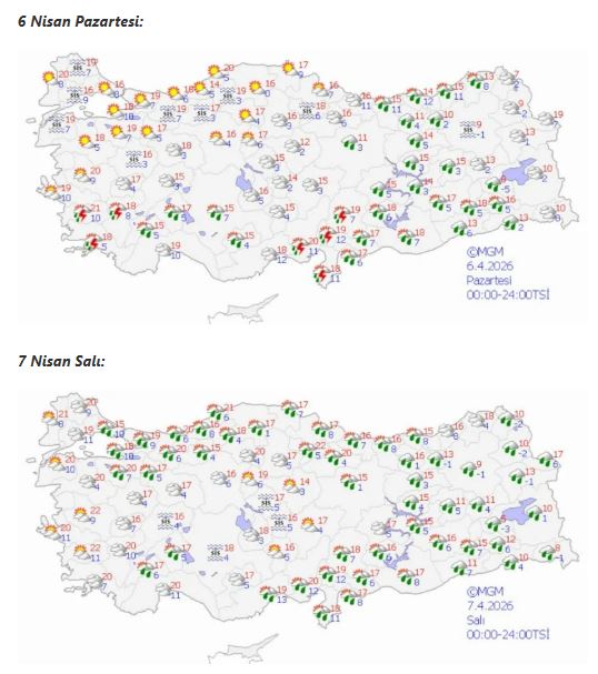 Bugün ülke genelinde parçalı ve yer yer çok bulutlu bir hava hakim olacak. Özellikle Akdeniz, Doğu Karadeniz, Doğu Anadolu’nun batısı, Güneydoğu Anadolu ile birlikte Aydın, Muğla, Denizli, Uşak, Konya, Karaman, Niğde, Sivas ve Şırnak çevrelerinde aralıklı yağmur ve sağanak, yer yer gök gürültülü sağanak yağış öngörülüyor.
