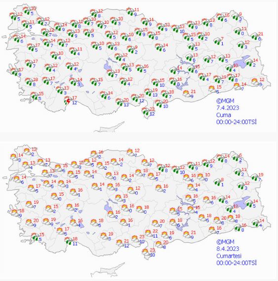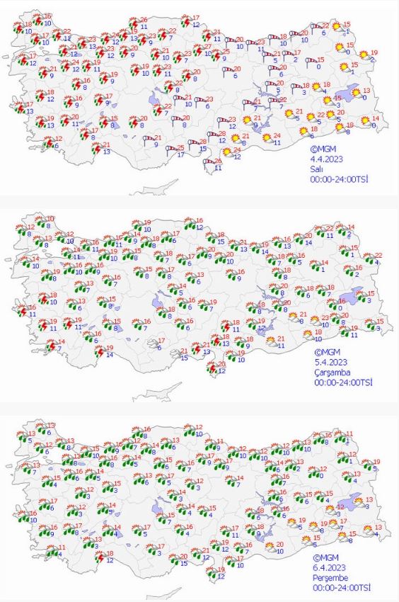 Meteoroloji Genel Müdürlüğü tarafından yapılan değerlendirmelere göre; kuzey, iç ve batı kesimlerinin parçalı yer yer çok bulutlu, Marmara, Ege, Batı Akdeniz, Doğu Akdeniz'in Toroslar mevkii, İç Anadolu'nun batısı, Batı ve Orta Karadeniz'in iç kesimleri ile Kırıkkale, Kırşehir, Yozgat, Zonguldak, Bartın, Artvin, Bayburt, Erzurum, Erzincan, Bingöl, Malatya, Elazığ ve Iğdır çevrelerinin yağmur ve sağanak yer yer gök gürültülü sağanak yağışlı geçeceği tahmin ediliyor.