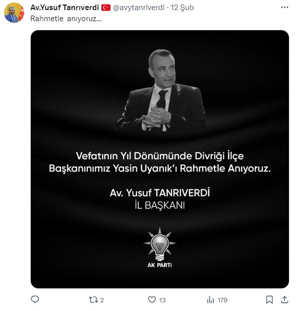 AK Parti Sivas İl Başkanı Avukat Yusuf Tanrıverdi geçtiğimiz yıl hayatını kaybeden Divriği İlçe Başkanını unutmadı.