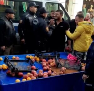 Edirne Belediyesi zabıta ekipleri, seyyar satıcının meyve sıkma makinesine el koyduğu sırada duruma sinirlenen seyyar satıcı tezgahtaki meyveleri yere saçtı. Vatandaşlar ise büyük tepki gösterdi.