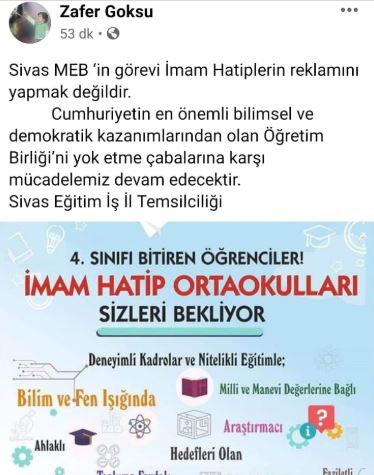 "Sivas MEB ‘in görevi İmam Hatiplerin reklamını yapmak değildir. Cumhuriyetin en önemli bilimsel ve demokratik kazanımlarından olan Öğretim Birliği’ni yok etme çabalarına karşı mücadelemiz devam edecektir. Sivas Eğitim İş İl Temsilciliği"