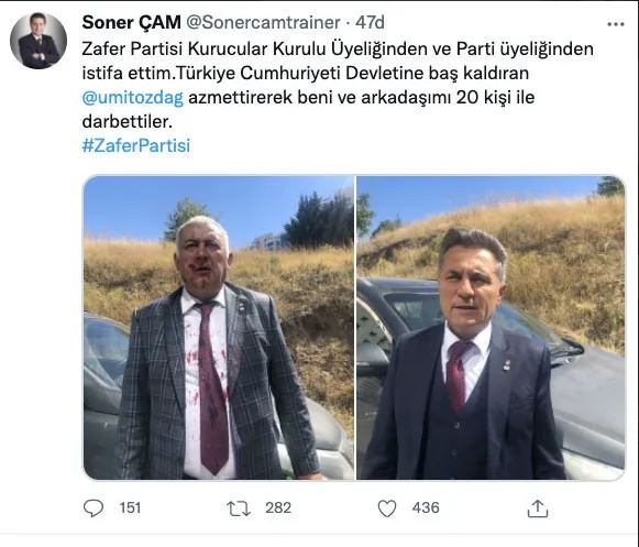 Zafer Partisi Kurucular Kurulu Üyesi Soner Çam, Zafer Partisi Genel Başkanı Ümit Özdağ'ın azmettirdiği 20 kişinin saldırısına uğradıklarını duyurdu. Çam, Zafer Partisi'nden istifa ettiğini söyledi.