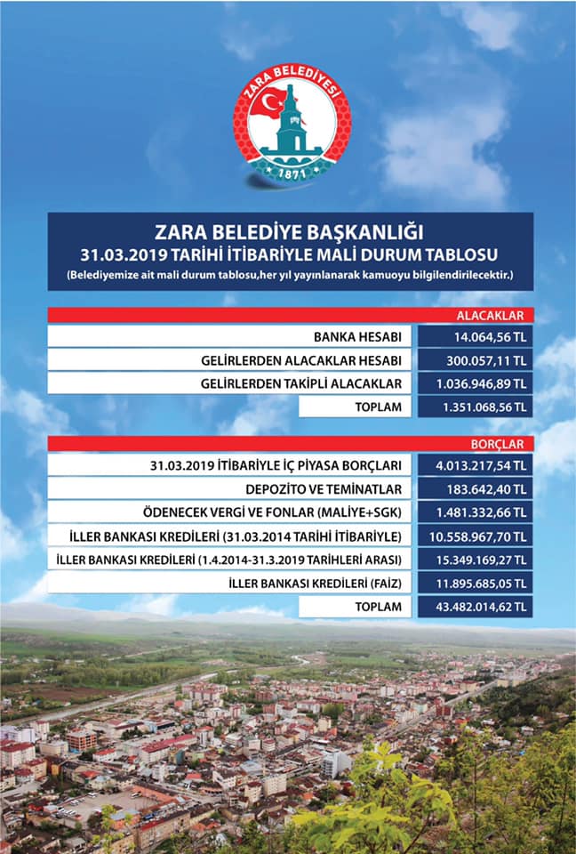 Başkan Çelik mali durumu açıklamadan önce asla enkaz devraldıklarını, bu borçlar varken benden hizmet beklemeyin demediğini ve demeyeceğini belirterek 5 yıl içerisinde de bu konudan yakınmayacağını ifade ettikten sonra Zara Belediyesi'nin borçlarını açıkladı.