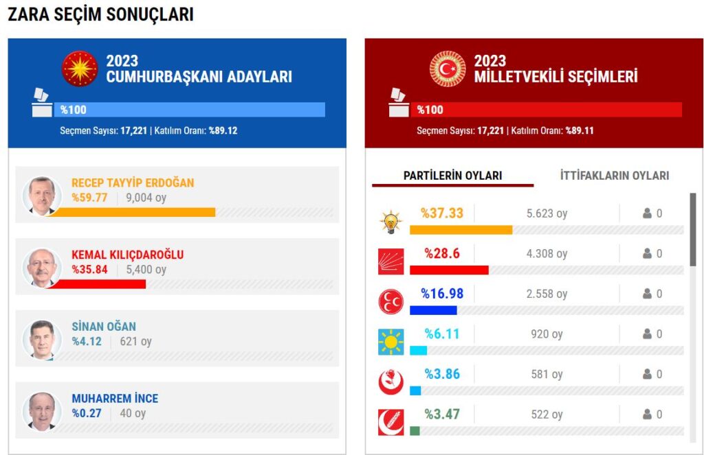 Zara ilçesinde yapılan seçim sonuçlarına göre;