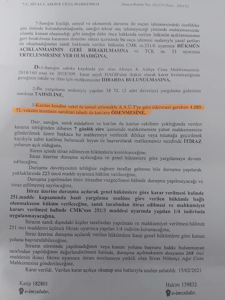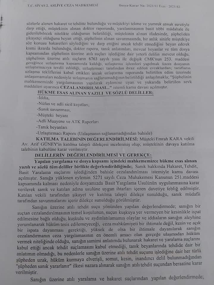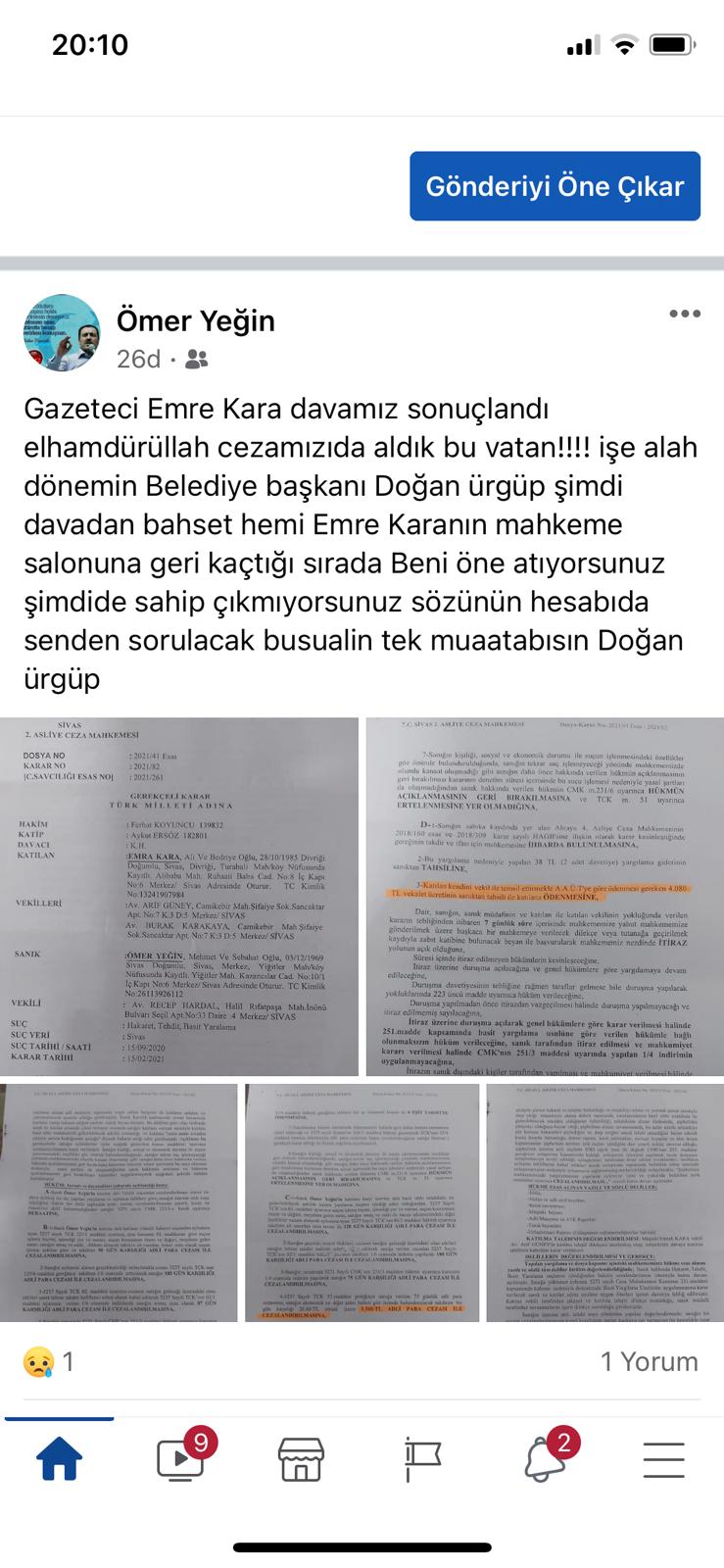 "Gazeteci Emre Kara davamız sonuçlandı elhamdülillah. Cezamızı da aldık. Bu vatan!!!! işe alah dönemin Belediye başkanı Doğan ürgüp şimdi davadan bahset he mi Emre Karanın mahkeme salonuna geri kaçtığı sırada Beni öne atıyorsunuz şimdide sahip çıkmıyorsunuz sözünün hesabı da senden sorulacak bu sualin tek muhatabısın Doğan Ürgüp"